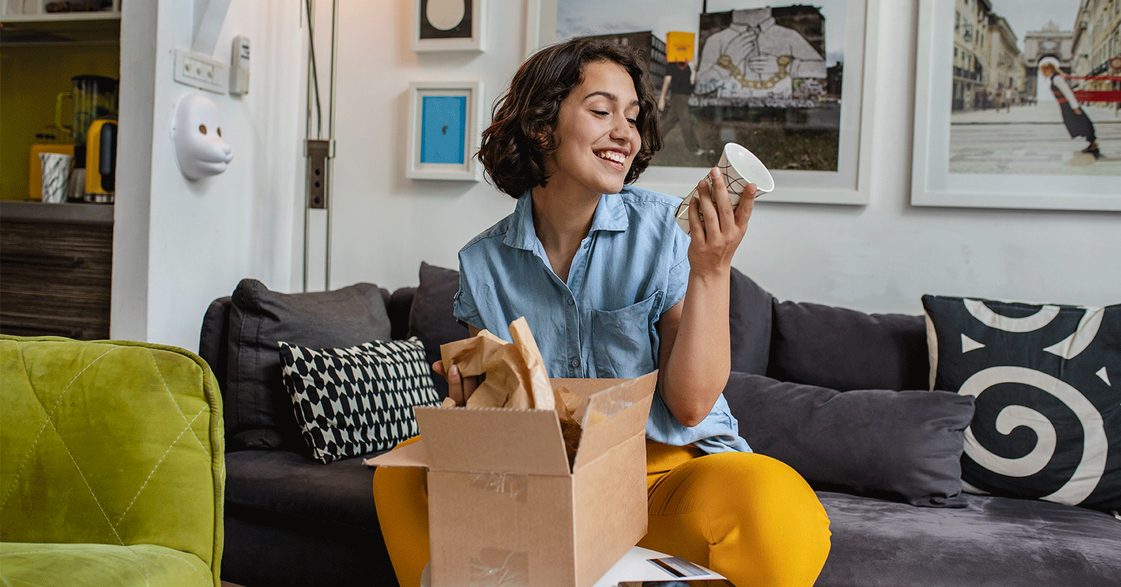 Une cliente enthousiaste découvre son colis, symbole d’une expérience d’achat réussie et d’une logistique maîtrisée.