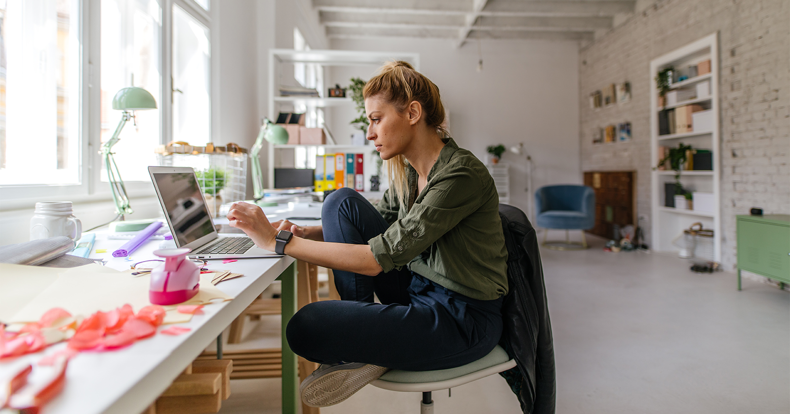 Une professionnelle gère avec confiance la logistique de sa boutique de cosmétiques en ligne depuis son bureau.